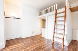 As you enter from the communal hallway you are greeted by a bright studio room. The property has a mezzanine level sleeping area, complete with a good sized kitchen and separate bathroom with electric shower below.